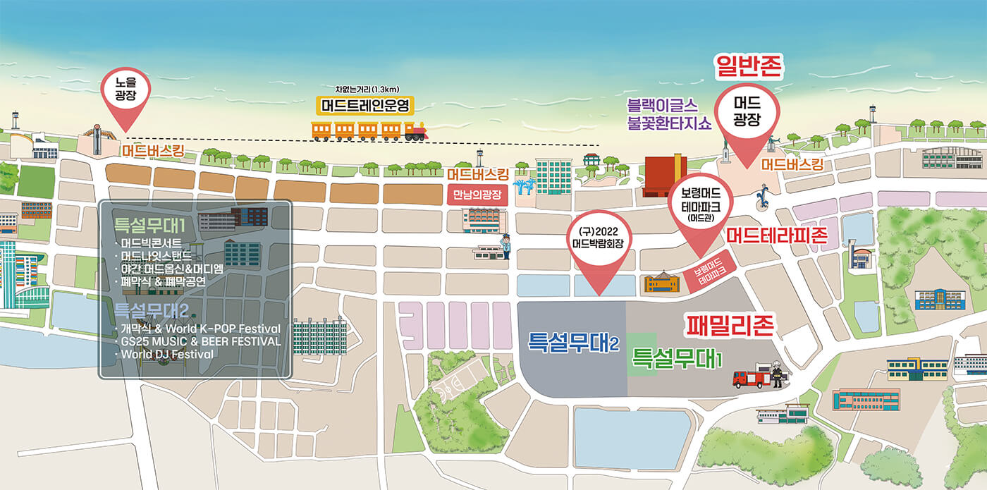 - 2023. 7. 21 - 머드체험시설 개장식 (머드광장) - 시민문화한마당 및 개막전야제 (동대한내로 터리) - 머디엠 (머드 EDM공연) (박람회장 특설무대 1)